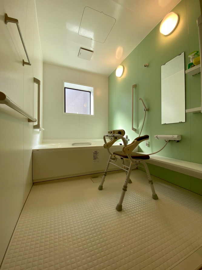 一般のご家庭にあるタイプと同じような仕様となっておりますが、洗い場の面積も広く作られておりますので、ヘルパーも介助しやすくなっています。
